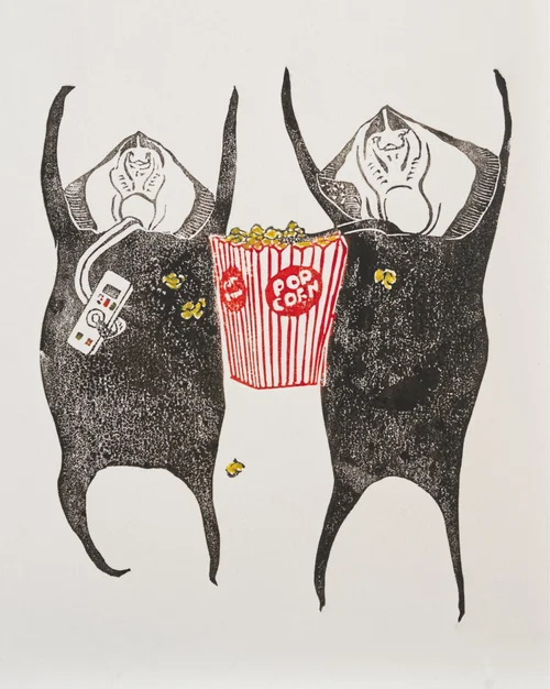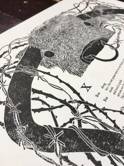 The local Wild life, emphasis on wild! Linoleum prints based in fact and fiction. How I sometimes see the similarities and humour in traits of living species, Homo Erectus included.